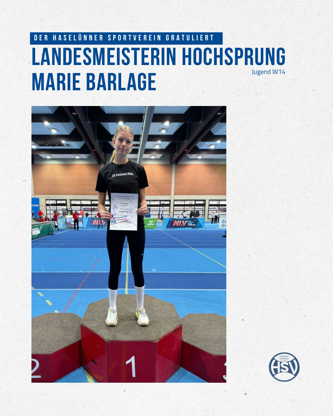 Mit Marie Barlage stellte der Haselünner SV eine Athletin. (startberechtigt für die LG Emsland Mitte). In gleich zwei Disziplinen ging Marie an den Start. Im Weitsprung und im Hochsprung. Aufgrund der hohen Teilnehmerzahl entschloss sich der Niedersächsische LeichtathletikVerband (NLV) die Anzahl auf 20 Athletinnen zu reduzieren. Eine Weite von 4,50 Meter war hier erforderlich. Diese konnte Marie vorweisen und war somit für den Weitsprung-Wettkampf am Samstag zugelassen. Leider verlief dieser nicht nach ihren Vorstellungen. Nach dem 3. Durchgang standen leider nur 4,20 Meter auf dem Blatt Papier, dieses reichte nicht für den Endkampf. Am Ende stand ein 12. Platz zu Buche.